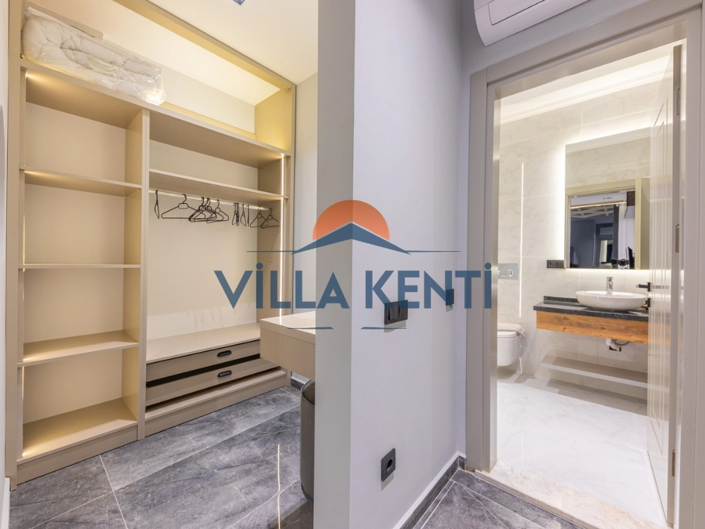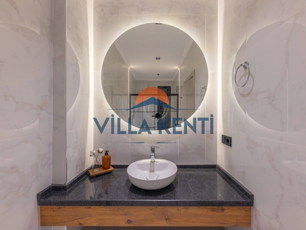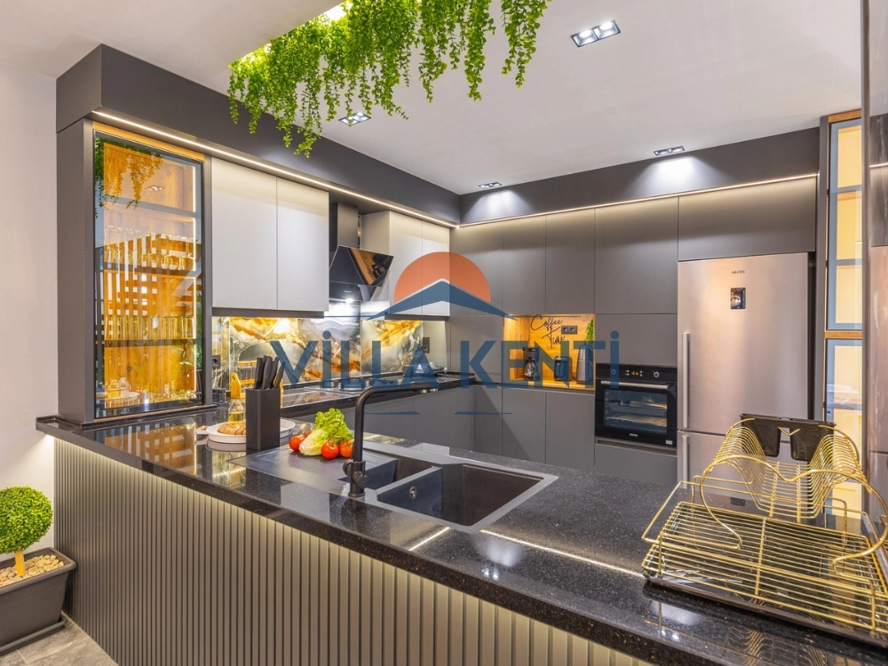 * Giriş Katı: Modern bir Amerikan mutfak, ferah bir salon ve özellikle merdiven çıkmak istemeyen misafirlerimiz için ideal olan bir adet yatak odası (1 çift + 1 tek kişilik yatak) bulunmaktadır.