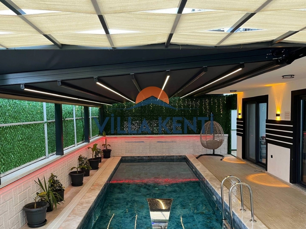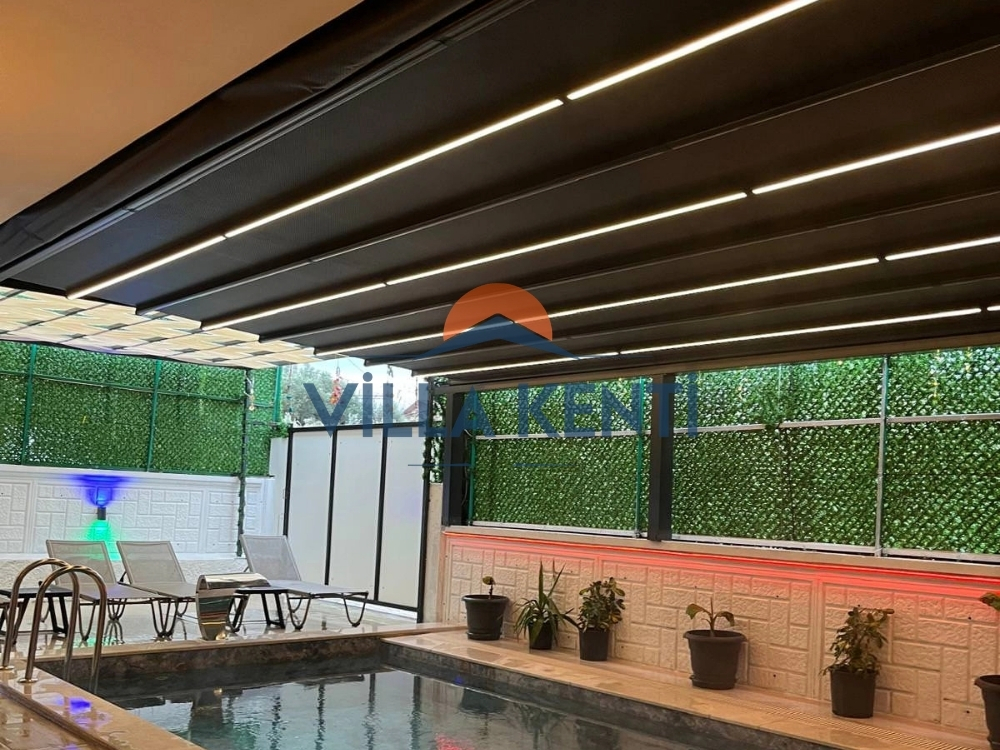 * Otomatik Tente (Pergule) Sistemi: Havuzun üzeri otomatik kumandalı tente sistemi ile tamamen kapatılabilir. Bu özellik, rüzgarlı veya yağışlı havalarda dahi havuz keyfinizin bölünmesini engeller.
