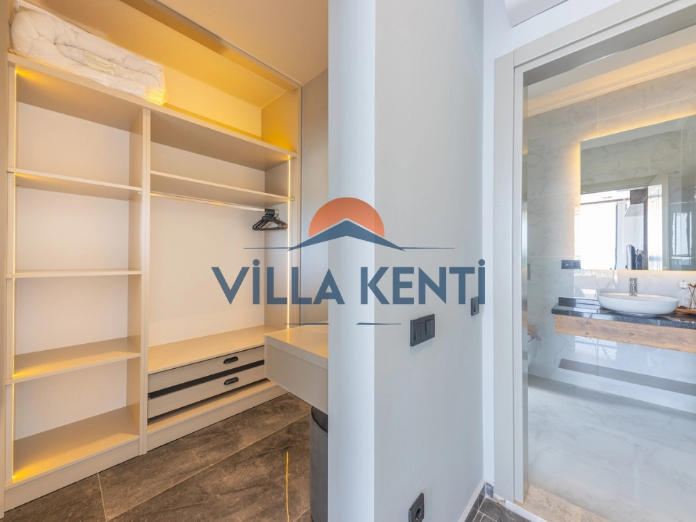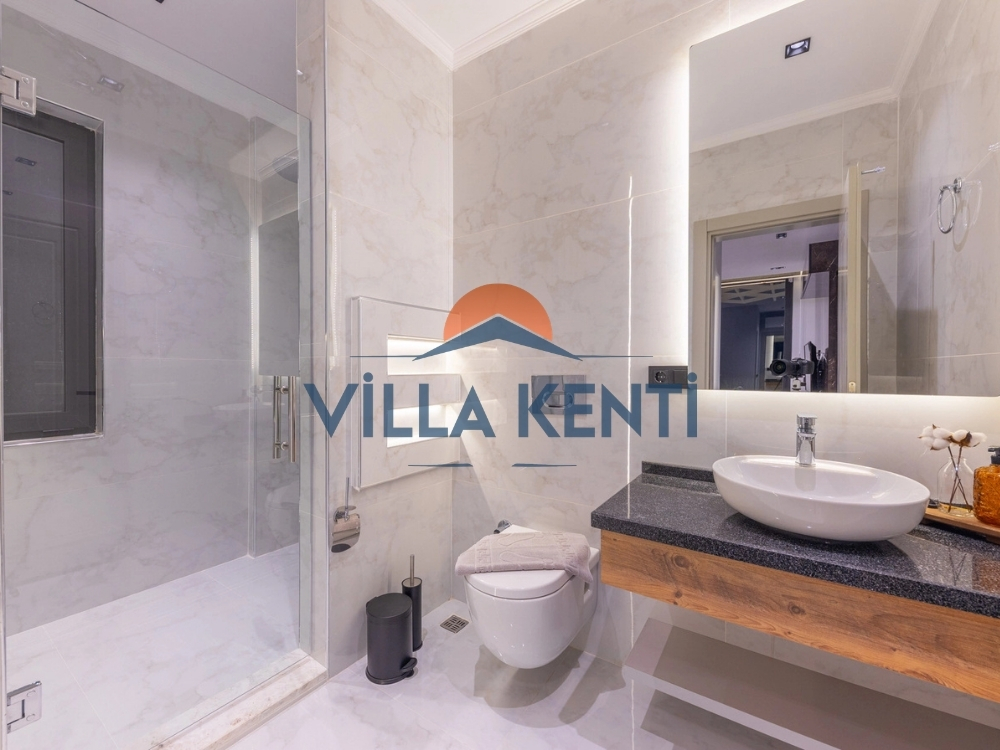 * Giriş Katı: Modern bir Amerikan mutfak, ferah bir salon ve özellikle merdiven çıkmak istemeyen misafirlerimiz için ideal olan bir adet yatak odası (1 çift + 1 tek kişilik yatak) bulunmaktadır.
